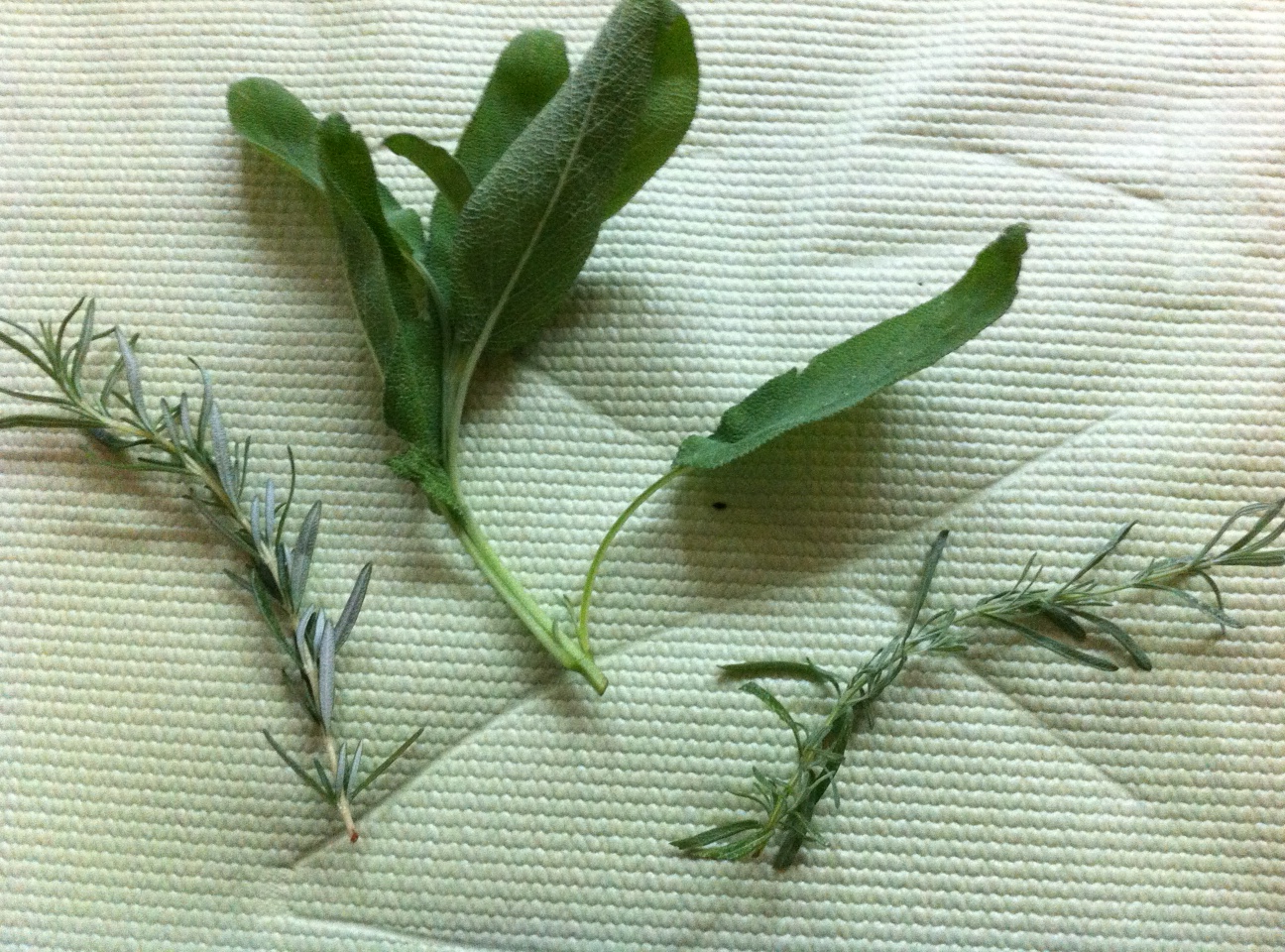 - Mixed Herbs: See below… rosemary is deeper green, woodier, and generally sturdier than lavender–and the smells are unique. Sage is the broader-leafed green in the middle. All are excellent for cooking. I like a little sage in my eggs, a little lavender in the water I use to boil fresh green beans, and lots of rosemary with my pork, potatoes, or carrots.